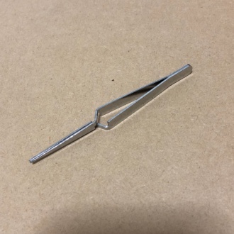 通常、ピンセットは細かなものを掴むのに使用するのはみなさんご存知の通りですが、このピンセットは通常の逆の使い方となります。つまり、掴むことで開き、離すことで掴むというものです。一般には「逆作用ピンセット」という名称で知られています(ダイソーさんでは「ハンダ用ピンセット」として販売されています)。