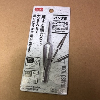 この逆作用ピンセット、gootさん、アネックスさん、エンジニアさんなどの工具メーカーさんから発売されていますが、ダイソーさんでも売られています。工具系の商品が充実したダイソーさんであれば置いてある可能性は高いかと思いますので、細かなハンダづけを伴う作業にトライする際には是非1つ持っておくことをおすすめします。