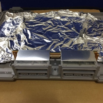両面テープでアルミホイルを貼り付けます。なお、筐体底側の中央部は、LED部の取り付けのためアルミホイルを少し切り取っておきます。
