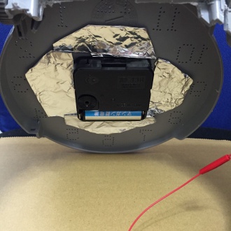 今回は「筐体内の文字盤円周にLEDを配置」ではなく「1つのLEDを中央に配置」という構想です。そうすると、どうしても文字盤の下には光が届きにくいのではないかと思います。そこで、あくまで気休めですが、ディスクカバーと筐体内部にアルミホイルを設置して、少しでも光が届けられないかと考えました。